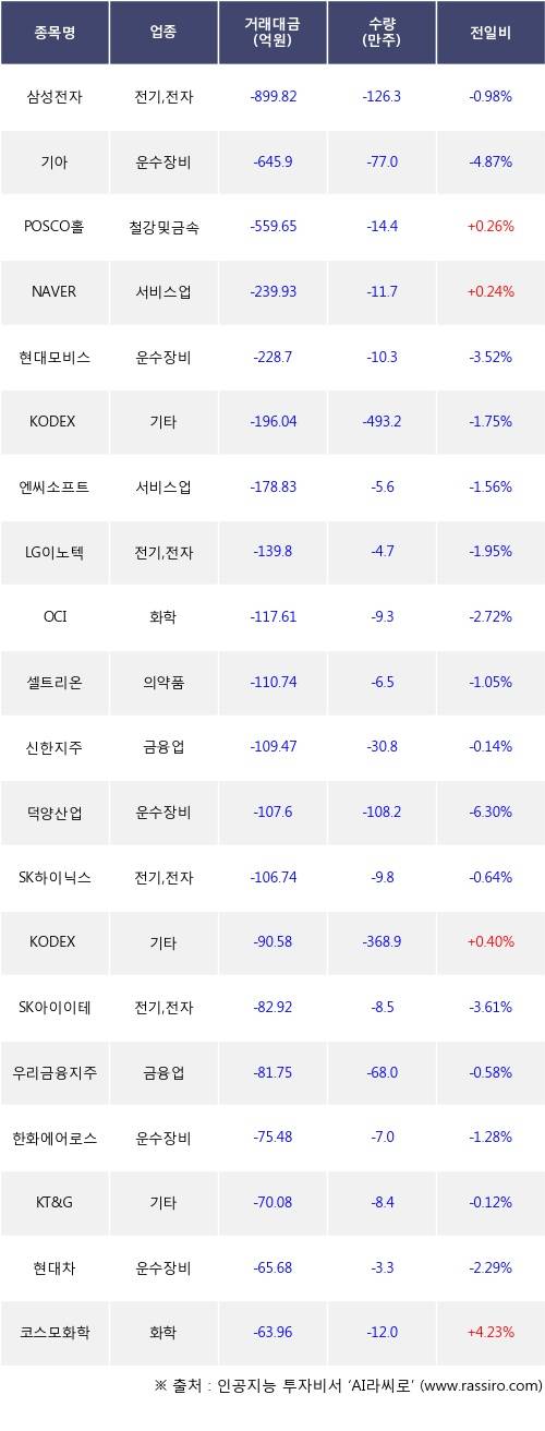 외국인 투자자의 순매도 상위 20개 종목은 삼성전자, 기아, POSCO홀딩스, NAVER, 현대모비스, KODEX 코스닥150선물인버스, 엔씨소프트, LG이노텍, OCI, 셀트리온등이다.