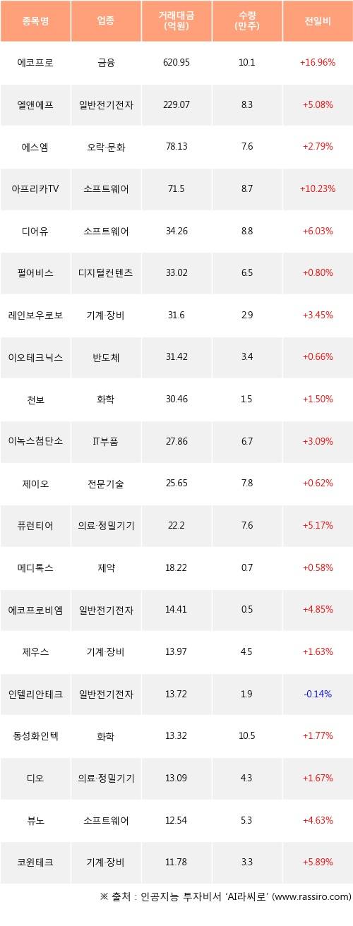 기관 투자자의 순매수 상위 20개 종목은 에코프로, 엘앤에프, 에스엠, 아프리카TV, 디어유, 펄어비스, 레인보우로보틱스, 이오테크닉스, 천보, 이녹스첨단소재등이다.