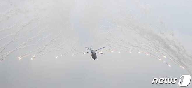 (포천=뉴스1) 사진공동취재단 = 7일 오후 경기 포천시 승진과학화훈련에서 열린 2023 연합·합동 화력 격멸훈련에서 수리온 헬기가 플레어를 발사하고 있다. 2023.6.7/뉴스1