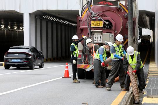 7일 대전 유성구 진터지하차도에서 유성구청 건설과 관계자들이 여름철 태풍 및 우기를 대비해 지하차도 하수도 준설작업을 하고 있다. 구는 점검반을 편성하여 오는 20일까지 관내 오·우수관로 등 하수도 시설물에 대한 일제점검을 추진할 예정이다.