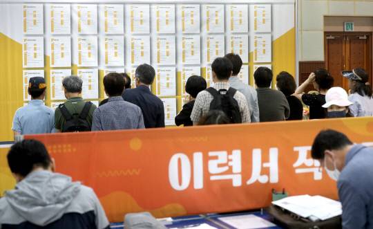2023 상반기 대전 서구 굿잡(JOB)일자리 박람회가 7일 배재대학교 21세기관 스포렉스홀에서 열려 구직자들이 이력서 작성 및 채용정보를 살펴보고 있다.
