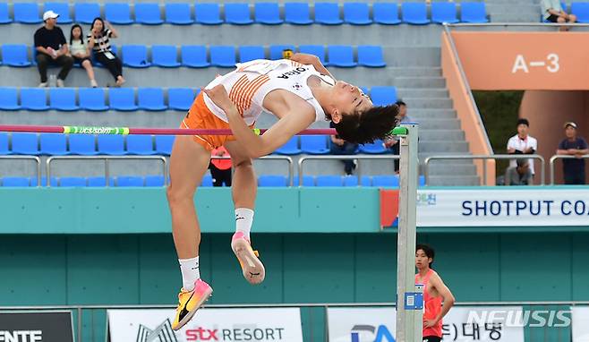 [예천=뉴시스] 이무열 기자 = 최진우(18·울산스포츠과학고)가 7일 오후 경북 예천스타디움에서 열린 제20회 예천아시아 U20 육상경기선수권대회 높이뛰기 결선에서 2m20을 넘고 있다. 2023.06.07. lmy@newsis.com