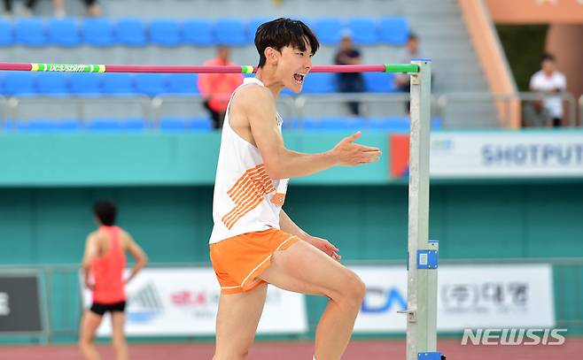 [예천=뉴시스] 이무열 기자 = 최진우(18·울산스포츠과학고)가 7일 오후 경북 예천스타디움에서 열린 제20회 예천아시아 U20 육상경기선수권대회 높이뛰기 결선에서 2m20에 성공한 뒤 기뻐하고 있다. 2023.06.07. lmy@newsis.com