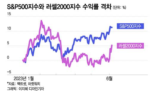 러셀2000지수는 올들어 5.4% 올라 수익률이 11.6% 상승한 S&P500지수의 절반도 안 된다. 기술주 중심의 나스닥지수는 올들어 26.9% 급등했다.