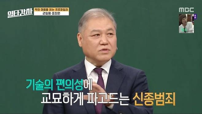 권일용은 "인간의 편의를 위해 발전시킨 기술이 교모하게 신종범죄가 파고든다"며 사회의 변화와 범죄의 연대성에 대해 설명을 이어갔다.