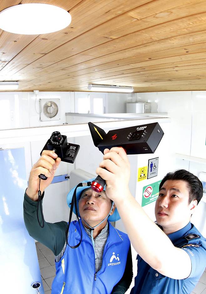 광주 북구 본촌동 한 어린이공원 공중화장실에서 7일 구청 공무원과 북부경찰서 순찰대원들이 불법촬영 카메라 탐지기를 이용해 합동점검을 실시하고 있다.