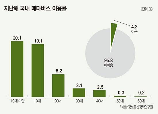 장밋빛 전망 속에 최근 몇 년 동안 기업들이 너도나도 메타버스 시장에 뛰어들었지만, 이제 인기가 한풀 꺾였다는 분석이 나온다. 정보통신정책연구원에 따르면 지난해 우리나라 국민의 메타버스 이용률은 4.2%에 그쳤다. 설문조사 응답자 9941명 중 417명만 메타버스를 이용한다고 답했다. 6~10세 미만(20.1%), 10대(19.1%)를 제외하면 나머지 연령대는 이용률이 한 자릿수에 그친다. 20대(8.2%), 30대(3.1%), 40대(2.5%) 등 연령이 높을수록 이용률이 떨어진다. 이마저도 대부분 ‘동물의 숲’ 26.9%, ‘제페토’ 26.6%, ‘마인크래프트’ 19.9%, ‘로블록스’ 16.2% 등 게임 기반 플랫폼을 이용했다. ‘메타폴리스(3.7%)’ ‘게더타운(1.2%)’ 등 가상 오피스 관련 플랫폼은 이용률이 저조했다.