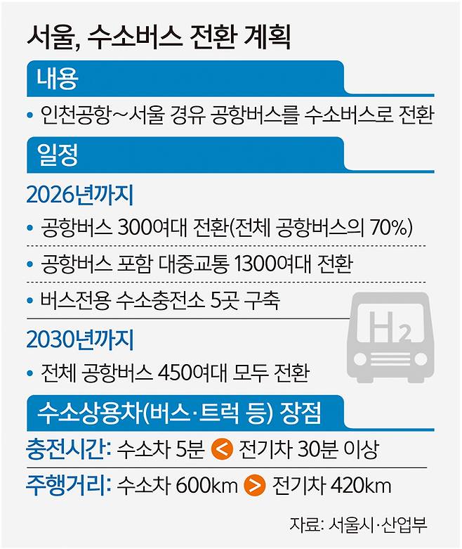 시는 수소버스가 장거리 노선을 운행하는 공항버스에 적합하다고 전했다. 전기버스의 충전시간이 30분 이상인 반면 수소버스는 5∼10분이면 충분하다. 주행거리도 600㎞가량으로 전기버스(420㎞)보다 길다.