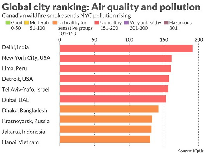 마켓워치에 따르면, 이 날 국제적 대기질 측정 사이트인 IQ 에어의 순위에서 뉴욕시가 1위인 인도 델리에 이어 최악의 공기질 2위를 기록했고 3위 페루 리마, 4위 미국 디트로이트로 나타났다.