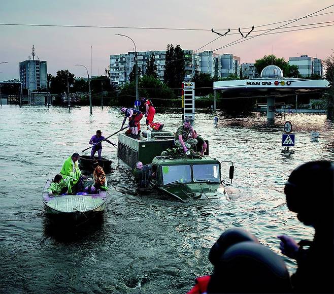 | 우크라 댐 파괴 보트 타고 긴급 대피 6일(현지 시간) 붕괴된 우크라이나 남동부 헤르손 노바카호우카댐 인근 주민들이 이날 저녁 보트를 타고 급히 대피하고 있다. 일부 주민은 차량의 윗부분에 올라탔다. 댐 파괴로 도심 곳곳이 물에 잠겼다. 헤르손=AP 뉴시스 |