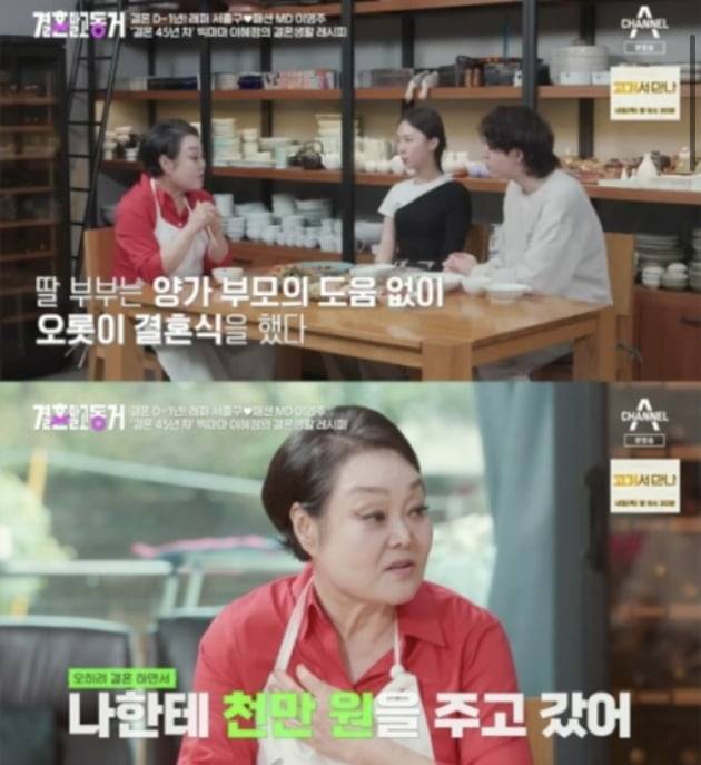 이혜정은 이어 "근데 우리 딸은 시집 갈 때 아무것도 안 해줬다. 정말 자기가 그동안 번 걸로. 집도 아무 것도 안 해주고 오히려 자기가 가면서 나한테 돈을 천만 원을 주고 갔다. 키워줘서 고맙다는 인사랑 같이 봉투에 돈이 들어있는데 정말 눈물이 펑펑 나더라고. 그날 제일 예쁘게 하는 데 쓰라고"라고 덧붙였다.