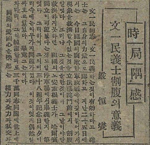 중앙청 할복 의거의 주인공이었던 문일민은 거사 후 2개월여가 지난 시점에 이르러 마침내 오랜 침묵을 깨고 입을 열었다. 12월 20일자 <독립신문>에 '동지동포께 일언(一言)함'이라는 장문의 글을 기고함으로써 자신이 할복한 까닭을 밝힌 것이다. 내용 중 일부를 발췌하면 다음과 같다. (참고: 아래 인용한 글은 깨지거나 빠진 글자, 현대 맞춤법에 어긋난 부분들이 많아 전체적으로 현대 문법에 맞게 다듬고 빠진 글자들 역시 문맥에 맞게 임의로 추가했음을 밝힌다 - 필자 주)