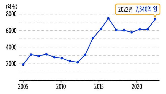 2005년부터 2022년까지 대한민국 우주 예산 규모를 그려봤어요. 2000년대 후반엔 2,000억~3,000억 대를 유지하다가 2012년부터 2016년까지 계속 예산이 늘어난 게 보일 겁니다. 이때 우주 관련 예산이 확 늘어난 영향으로 한국형 우주발사체 개발에 박차를 가할 수 있었어요. 하지만 R&D 대비 우주 예산의 비율을 살펴보면 그렇게 넉넉한 상황이 아닙니다. 2016년 3.91%를 정점으로 최근까지 줄곧 하락세를 이어오다가 2022년에 처음 반등에 성공한 거거든요.