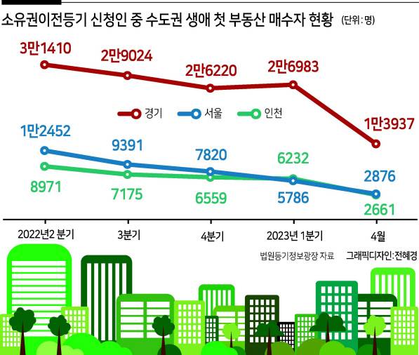 법원등기정보광장에 따르면 올해 1월부터 4월 말까지 ‘소유권이전등기(매매) 신청 매수인 중 생애 첫 부동산 매수자’는 전년 동기(15만6002명) 대비 3만명 이상 줄어든 12만4864명인 것으로 집계됐다.