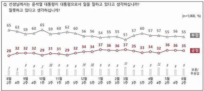 여론조사 전문업체 엠브레인퍼블릭·케이스탯리서치·코리아리서치·한국리서치가 지난 5~7일 만 18세 이상 남녀 1000명을 대상으로 공동 실시한 전국지표조사(NBS) 6월1주차 조사에 따르면 윤 대통령의 국정운영에 대한 긍정평가는 직전 조사 대비 1%포인트(p) 하락한 35%로 나타났다.