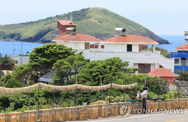 (제주=연합뉴스) 박지호 기자 = 8일 오전 제주시 한경면 고산리의 도로변에서 한 주민이 준치 오징어를 말리고 있다. 2023.6.8