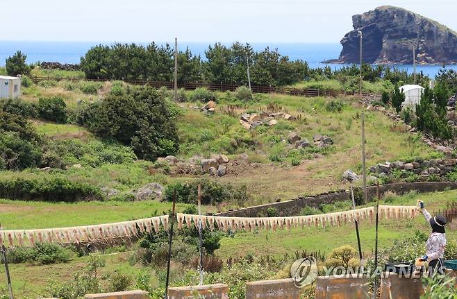 (제주=연합뉴스) 박지호 기자 = 8일 오전 제주시 한경면 고산리의 도로변에서 한 주민이 준치 오징어를 말리고 있다. 2023.6.8