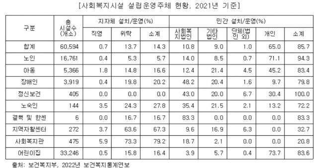 문제는 그 방향이 '산업화'와 '시장화'라는 것에 있다. 이미 우리의 사회서비스가 더 이상 시장화하기 어려울 만큼 시장화 되어 있다. 사실 우리나라에서 사회서비스 공급은 단 한 번도 국가에 의해 주도된 적 없으며, 언제나 민간에 맡겨져 왔다. 아래 표에도 제시된 것처럼 현재도 거의 모든 사회복지시설의 80% 이상이 민간에 의해 설치·운영된다. 특히 '사회서비스 산업화'의 방향이 수립된 노무현 정부 이후 20여 년간은 민간 영리기구의 사회서비스 공급이 계속해서 확대되었다. 그 기간 동안 여러 정부는 현 대통령의 인식처럼 민간의 공급자 간 경쟁이 서비스 질을 높일 것이라고 주장했지만 그런 결과는 나타나지 않았다. 오히려 민간의 공급자는 서비스 비용을 줄이기 위한 경쟁을 해왔고, 그 경쟁은 서비스 제공인력의 열악한 일자리로, 다시 열악한 일자리에서 제공되는 서비스의 낮은 질로 이어져왔다.
