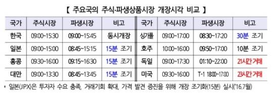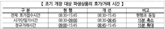 이로써 코스피200선물 등 대표 파생상품의 개장 시각은 현행 9시에 8시 45분으로 당겨진다. 파생상품시장 조기개장으로 파생상품시장의 정규거래시간은 15분 확대하고 시가단일가시간은 현행 30분에서 15분으로 축소한다.