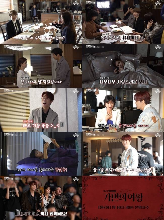 오랜만에 유정의 집 세트장에 모인 ‘가면퀸’ 4인방과 오지호, 신지훈은 대사 리딩부터 동선 정리 등 리허설을 일사천리로 진행했다. 식탁에 둘러앉은 이들은 슛소리와 함께 고도의 집중력을 발휘하는가 하면 각 캐릭터가 처한 상황에 몰입해 물오른 연기 호흡을 과시했다. 뿐만 아니라 그간의 호흡이 돋보이는 차진 케미로 웃음이 끊이지 않는 유쾌한 촬영 분위기를 만들었다.