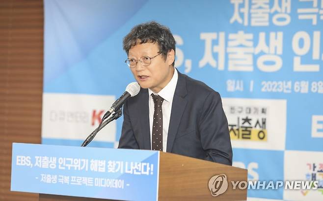 (서울=연합뉴스) 김유열 EBS 사장이 8일 서울 중구 한국프레스센터 열린 'EBS 저출생 극복 프로젝트 미디어데이'에서 인사말 하고 있다. 2023.6.8 [EBS 제공. 재판매 및 DB 금지]