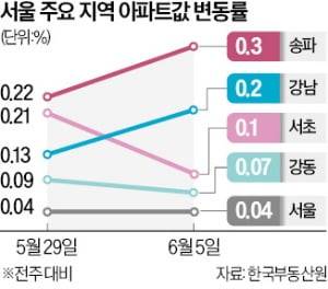 서울 집값을 반전시킨 방아쇠는 강남 3구(강남·서초·송파구)가 당겼다. 8일 한국부동산원에 따르면 송파구 아파트값은 이달 첫째 주(5일 기준) 0.3% 올랐다. 서울 25개 구 중 가장 높은 상승률이다. 강남구(0.2%) 서초구(0.1%)가 뒤를 이었다. 서초구는 8주 연속 상승세다.