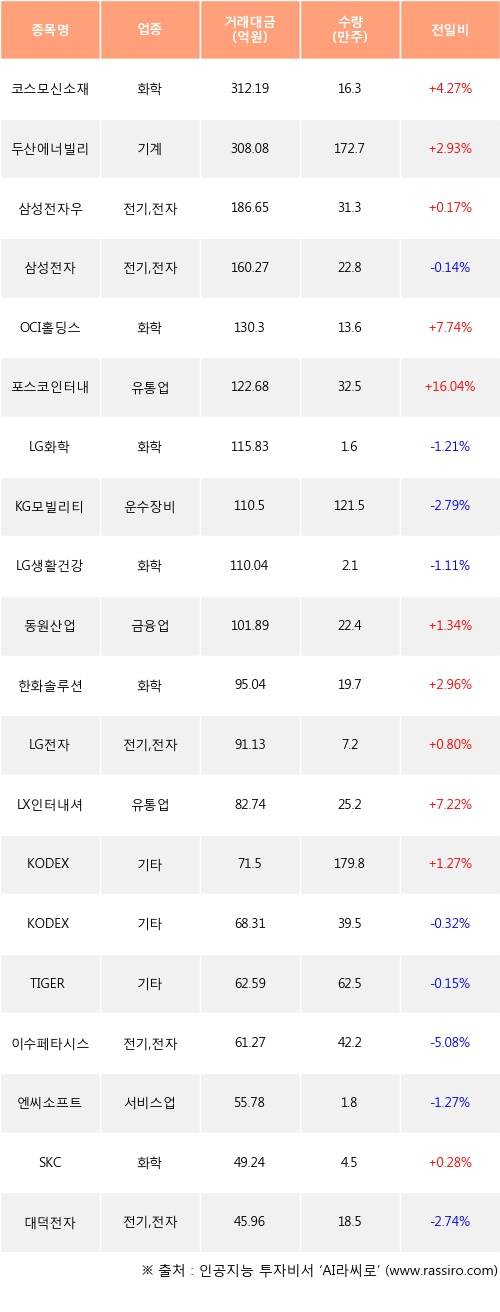 외국인 투자자의 순매수 상위 20개 종목은 코스모신소재, 두산에너빌리티, 삼성전자우, 삼성전자, OCI홀딩스, 포스코인터내셔널, LG화학, KG모빌리티, LG생활건강, 동원산업등이다.