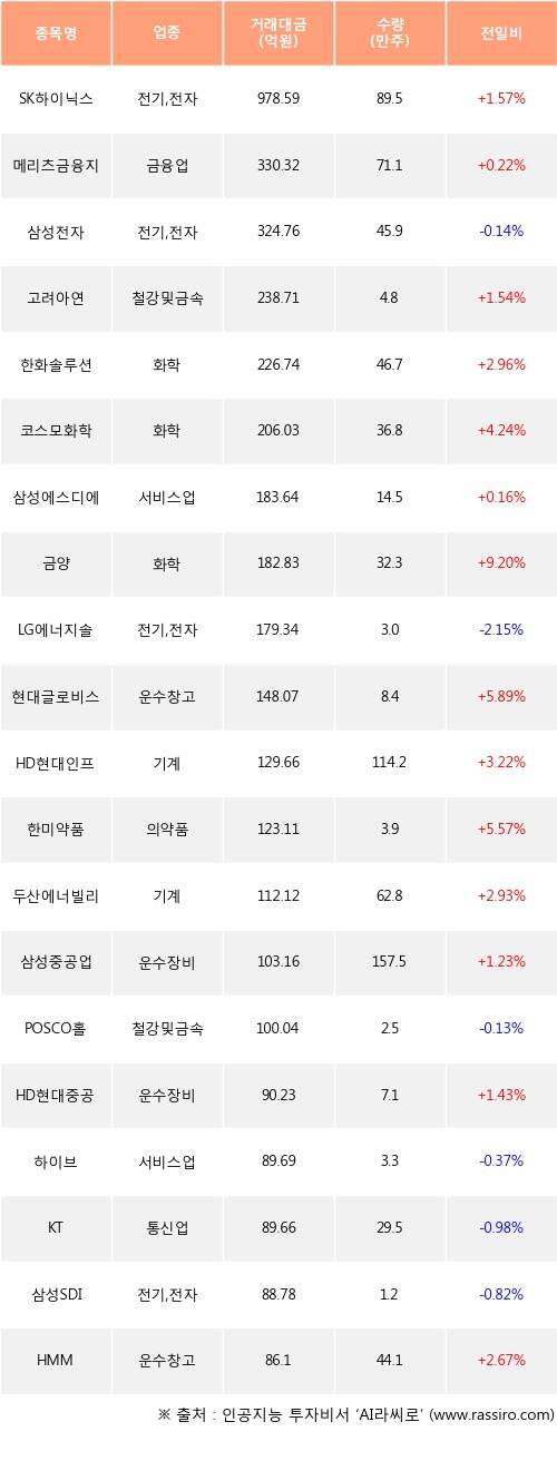 08일, 기관 거래소에서 SK하이닉스(+1.57%), 메리츠금융지주(+0.22%) 등 순매수