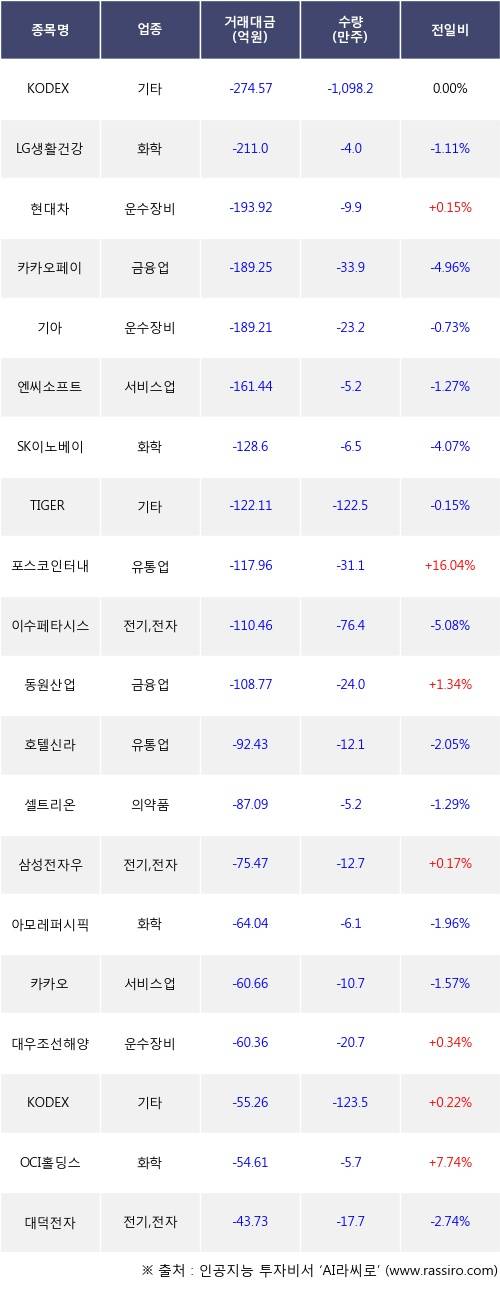 기관 투자자의 순매도 상위 20개 종목은 KODEX 200선물인버스2X, LG생활건강, 현대차, 카카오페이, 기아, 엔씨소프트, SK이노베이션, TIGER 차이나전기차SOLACTIVE, 포스코인터내셔널, 이수페타시스등이다.