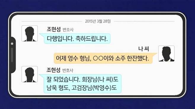 선정 다음날, 조 변호사가 '다행입니다. 축하드립니다'라는 문자 메시지를 보내자, 나 씨가 "어제 영수 형님, 이 모 씨와 소주 한잔했다"라고 답한 내용입니다.