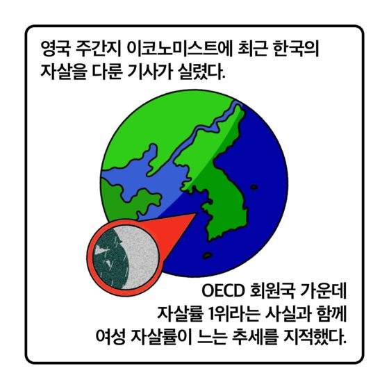 영국 주간지 이코노미스트에 최근 한국의 자살을 다룬 기사가 실렸다. 경제협력개발기구(OECD) 회원국 가운데 자살률 1위라는 사실과 함께 여성 자살률이 느는 추세를 지적했다. 자살률 통계를 보면 해외 언론이 한국에 주목하는 이유를 알 수 있다.
