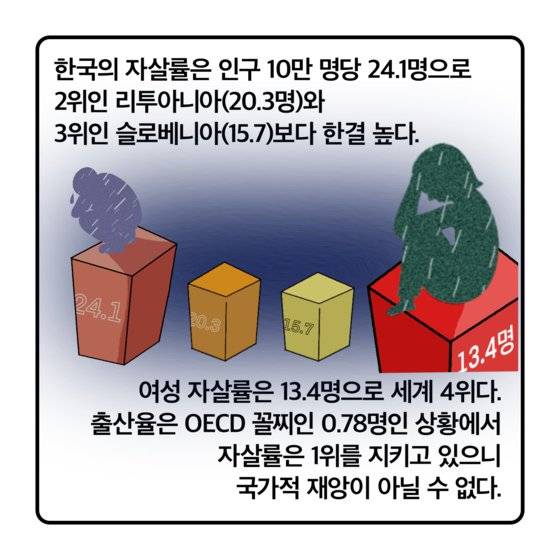 여성 자살률은 훨씬 심각하다. 13.4명으로 세계 4위다. 레소토·가이아나·짐바브웨 여성들만 한국보다 자살이 많다. 출산율은 OECD 꼴찌인 0.78명인 상황에서 자살률은 1위를 지키고 있으니 국가적 재앙이 아닐 수 없다.