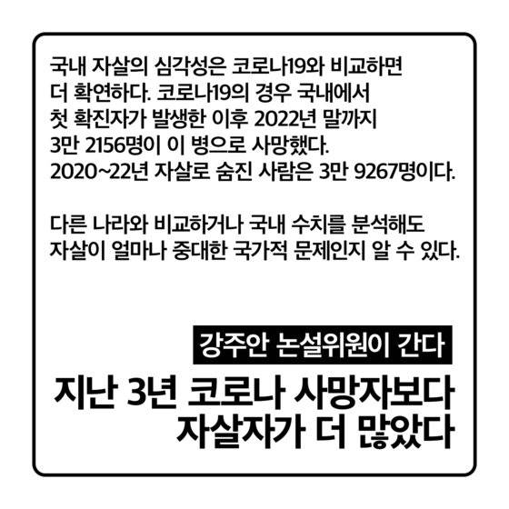 국내 자살의 심각성은 코로나19와 비교하면 더 확연하다. 사상 최악의 감염병인 코로나19의 경우 2020년 1월 20일 국내에서 첫 확진자가 발생한 이후 2022년 말까지 3만 2156명이 이 병으로 사망했다. 2020~22년 자살로 숨진 사람은 3만 9267명이다(※2022년 1만 2720명은 잠정치). 다른 나라와 비교하거나 국내 수치를 분석해도 자살이 얼마나 중대한 국가적 문제인지 알 수 있다.