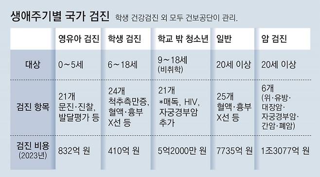 우리나라 생애주기별 국가검진을 살펴보면 이상한 점이 있다. 영유아 검진, 학교 밖 청소년 건강진단, 성인을 대상으로 하는 일반 건강검진 등을 책임지고 담당하는 기관은 국민건강보험공단(건보공단)이다. 하지만 초중고교 학생 건강검진만 유일하게 교육부 소관으로 돼 있다.