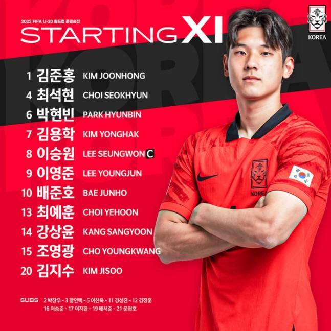수비형 미드필더에는 박현빈(인천 유나이티드)이 선다. 포백은 최예훈(부산 아이파크)-김지수(성남FC)-최석현(단국대)-조영광(서울)이 자리한다. 골키퍼 장갑은 김준홍(김천)이 낀다. 선수비 후역습 전략으로 나서는만큼 수비진의 중요성은 설명이 필요없다. 김 감독은 "4강에 올라온 팀들은 최강의 전력을 갖추고 있다. 우리도 잘 준비해 경기를 치르겠다"며 "시간이 짧아서 새롭게 변화를 주긴 어렵고, 우리 선수들이 그동안 잘했던 것을 펼치겠다"고 각오를 밝혔다.