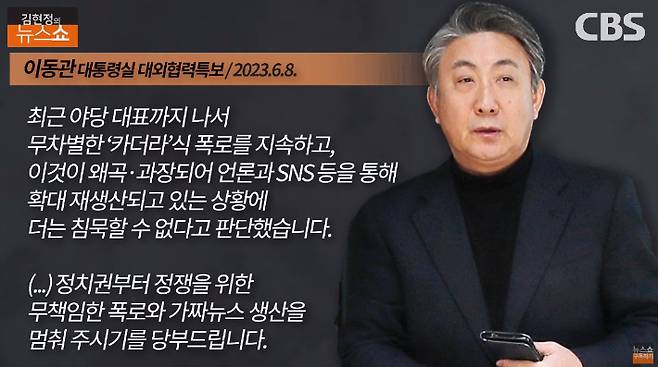 ◇ 김현정> 아니, 방심위에 걸릴까 봐는 아니고 입장문을 제가 들고 있기 때문에 중간중간에 팩트 확인해 드리는 겁니다.