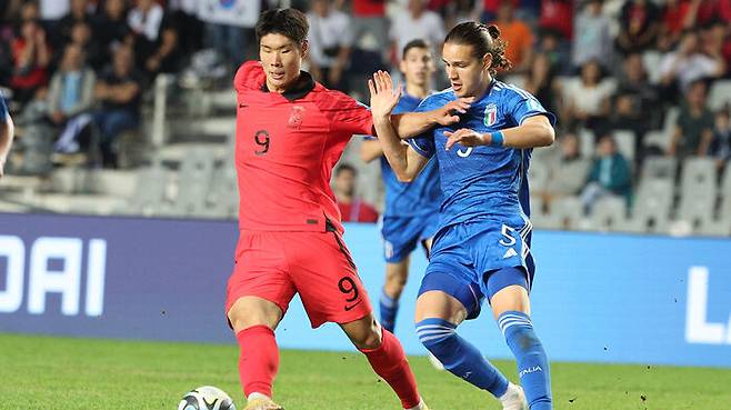 김은중호 공격 전개에서 연결고리 역할을 하는 장신 스트라이커 이영준은 지금까지 상대한 선수 중 가장 체격이 좋은 이탈리아 수비진에 고전했습니다.