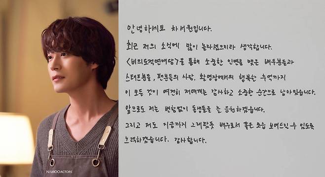 차서원은 "최근 저의 소식에 많이 놀라셨으리라 생각한다"며 "드라마에서 인연을 맺은 배우분들과 스태프분들, 팬분들의 사랑은 여전히 소중한 순간으로 남아있다"고 말했다.