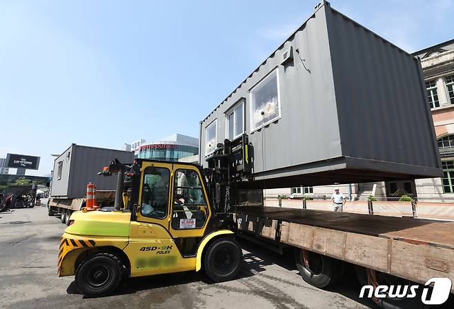 (서울=뉴스1) 신웅수 기자 = 신종 코로나바이러스 감염증(코로나19) 위기 단계가 '하향'으로 조정된 가운데 9일 오전 서울역광장에 마련된 임시 선별검사소에서 관계자들이 선별진료소로 사용된 컨테이너를 철거하고 있다. 2023.6.9/뉴스1