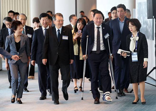 최태원 SK그룹 회장 겸 대한상공회의소 회장이 오늘(9일) 부산 시그니엘호텔에서 열린 '한일상의 회장단회의'에 목발을 짚고 나타났습니다.