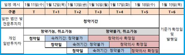 숙려제도에 대해 조금 더 살펴보면 개인인 일반투자자를 대상으로 숙려대상이 되면 청약매체에 관계없이 청약 후 2영업일 이상의 숙려기간이 필요하다. 숙려기간에는 청약이 불가하며 영업정 방문, 유선, 해당 청약매체를 통한 청약취소 신청만 가능하다. 숙려기간이 지난 후 청약의사확정일 마감시간 전까지 최종청약 확인 의사표시를 해야만 청약이 확정되고, 금융투자회사가 고객으로부터 서명, 기명날인, 녹취 등의 방법으로 청약 등의 의사가 확정적임을 확인받지 못하는 경우 해당 청약은 자동 취소된다.