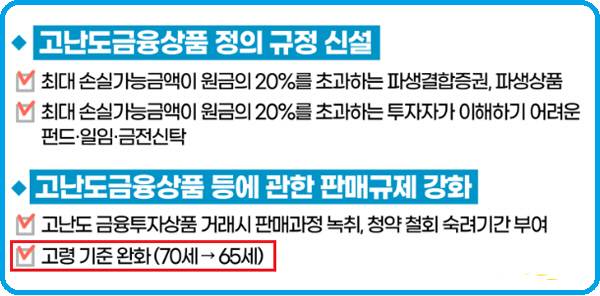 자본시장법 시행령 개정으로 개인일반투자자 대상으로는 고난도 금융상품 거래 시 판매과정 녹취를 포함한 2일 이상의 숙려기간이 부여되었다. 숙려기간 후 매매의사 미확정 시 청약이 자동 철회되고 투자금이 반환된다. 고령자 기준도 70세에서 65세로 변경되었다. 고난도 금융투자상품을 도입함으로 대상자는 기관투자자를 제외한 모든 투자자가 대상이 되었다.