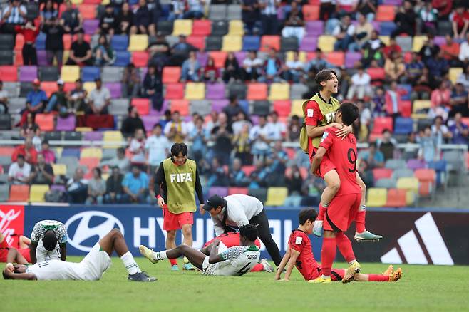 | ▲ [5일 월] 아르헨티나 산티아고 델 에스테로 스타디움에서 열린 2023 국제축구연맹(FIFA) 20세 이하(U-20) 월드컵 8강전 한국과 나이지리아의 경기에서 연장전 끝에 1:0으로 승리를 거둔 대표팀 선수들이 자축하고 있다. 한국은 2019년 폴란드 대회에 이어 2연속 준결승에 오르면서 아시아 국가 중 최초로 U20 월드컵 2연속 4강 진출에 성공한 팀이 됐다. |
