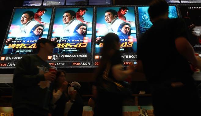 | ▲ [6일 화] 서울 시내 한 극장에서 관람객들이 영화 <범죄도시3> 홍보물 앞을 지나고 있다. 배급사 에비오엔터테인먼트에 따르면 <범죄도시3>는 개봉 엿새 만인 5일 오후 4시 40분께 누적 관객 수 500만 명을 넘겼다. |