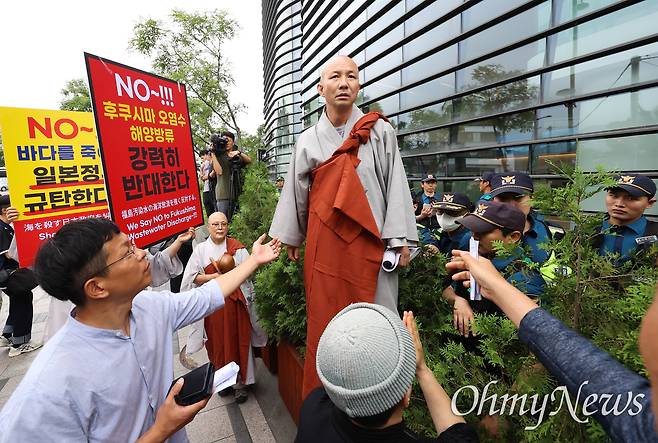 | ▲ [7일 수] 서울 종로구 주한일본대사관 부근에서 열린 '제1599차 일본군 성노예제 문제해결을 위한 정기 수요시위'에 참석한 조계종 사회노동위원회 스님이 일본의 후쿠시마 오염수 방류에 대해 일본대사에게 직접 항의하겠다며 대사관 정문으로 향하자 경찰들이 제지하고 있다. |