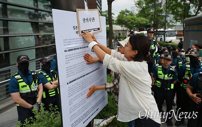 | ▲ [8일 목] '세계 해양의날'인 이날 서울 종로구 일본대사관 앞에서 일본 방사성 오염수 해양투기 저지 서울행동 발족 기자회견을 마친 참가자들이 일본대사관에 항의서한 전달이 무산되자 대사관 앞 기둥에 항의서한을 테이프로 붙이고 있다. 이들은 "일본 정부는 후쿠시마 원전 오염수를 자국 육지에 보관하라"고 요구했다. |