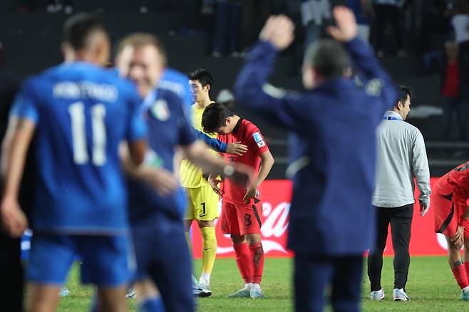 | ▲ [9일 금] 아르헨티나 라플라타 스타디움에서 열린 2023 국제축구연맹(FIFA) 20세 이하(U-20) 월드컵 4강전 한국과 이탈리아의 경기에서 1-2로 패배한 한국 이승원이 고개를 숙이고 있다. 이로써 이탈리아는 사상 처음으로 이 대회 결승에 진출하며 새 역사를 썼고 한국은 12일 오전 2시 30분 같은 장소에서 이스라엘과 3·4위전을 치른다. |