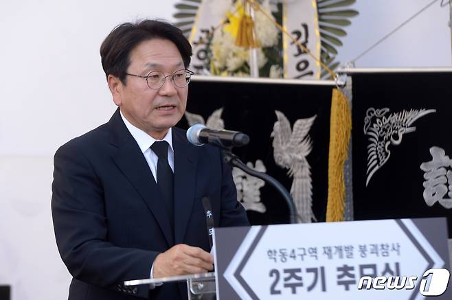 (광주=뉴스1) 이승현 기자 = 17명의 사상자가 발생한 광주 '학동 참사' 2주기인 9일 오후 광주 동구 증심사입구역 인근 사고 현장에서 열린 2주기 추모식에서 강기정 광주시장이 추모사를 하고 있다.