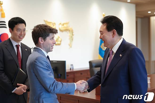 (서울=뉴스1) 오대일 기자 = 윤석열 대통령이 9일 용산 대통령실 청사에서 '챗지피티'(ChatGPT) 아버지로 불리는 샘 알트만 오픈에이아이(OpenAI) 대표를 접견하며 악수하고 있다. (대통령실 제공) 2023.6.9/뉴스1