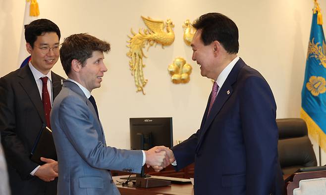| 尹과 악수 윤석열 대통령이 9일 용산 대통령실에서 생성형 인공지능(AI) 챗GPT 개발사인 오픈AI의 샘 올트먼 최고경영자(CEO)를 만나 악수하고 있다. 대통령실사진기자단 |